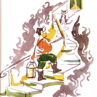 Na stubištu je bilo sasvim tamno, a u mraku je ležalo na stubama nešto sasvim crno. Samo su se dvije točke sjajile kao dvije crvene svijeće. To je bila dakako mačka, a njezine su se oči krijesile kao crvene svijeće. „O molim”, reče Hlapić mački, „ja sam već donio mlijeko, samo mi izvoli pokazati put”.