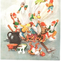Die Alte erzählte nun den Hausgeistchen alles, was sich begeben hatte. Die Hausgeistchen setzten sich rund um den Herdrand herum, ließen die Beinchen an diesem herabhängen, hörten, wie Klette an Klette aneinandergereiht, der Alten zu und schüttelten ihre Köpfe vor Staunen. Schüttelten sie die Köpfe, so glühten dabei die roten Käppchen auf: man konnte meinen, das Feuer am Herde sei es, das Flämmchen sprühe.