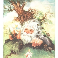 Mit einemmal, als Kosjenka um die mächtigste Mauer bog, da, unter der Mauer, sah sie einen Menschen schlafen. Mächtig groß war dieser Mensch, größer als die mächtigste Eiche im mächtigsten Wald. Ein Mantel, riesengroß und vom dichtesten Leinen, bedeckte ihn und mit einem fünf Klafter langen Gürtel war er umgürtet. Sein Kopf war so groß wie das größte Faß und sein Bart wie ein Schober Maisstroh, so wirr und struppig. So riesengroß war dieser Mensch, daß man meinen konnte: ein Kirchturm läge dort längs der Mauer gestreckt.